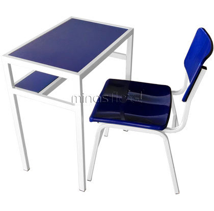 Tampo e porta livros confeccionado em laminado melamínico de baixa pressão (18mm). Ponteiras, assento e encosto confeccionados em polipropileno.